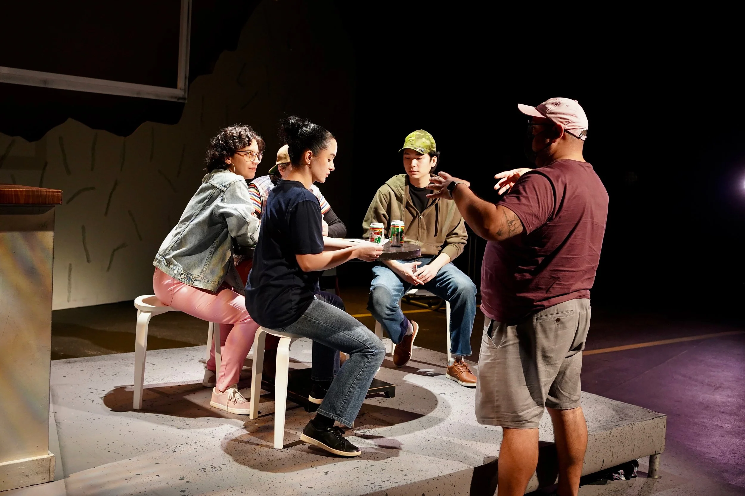 Peace Country at the Firehall Arts Centre. Cast -(Left to Right) Manuela Sosa, Kaitlyn Yott, Sof Rodreguiez, Sara Vickruck & Angus Yam. Set by Kim Reddy, Lights Jonathan Kim, Projection Andie Llyod.